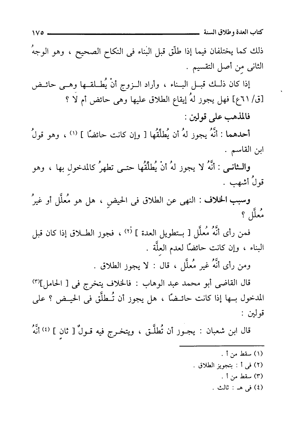 فمن رأى أنَّهُ مُعلَّل [بتطويل العدة] (¬2)، فجوز الطلاق إذا كان قبل البناء، وإن كانت حائضًا لعدم العِلَّة.