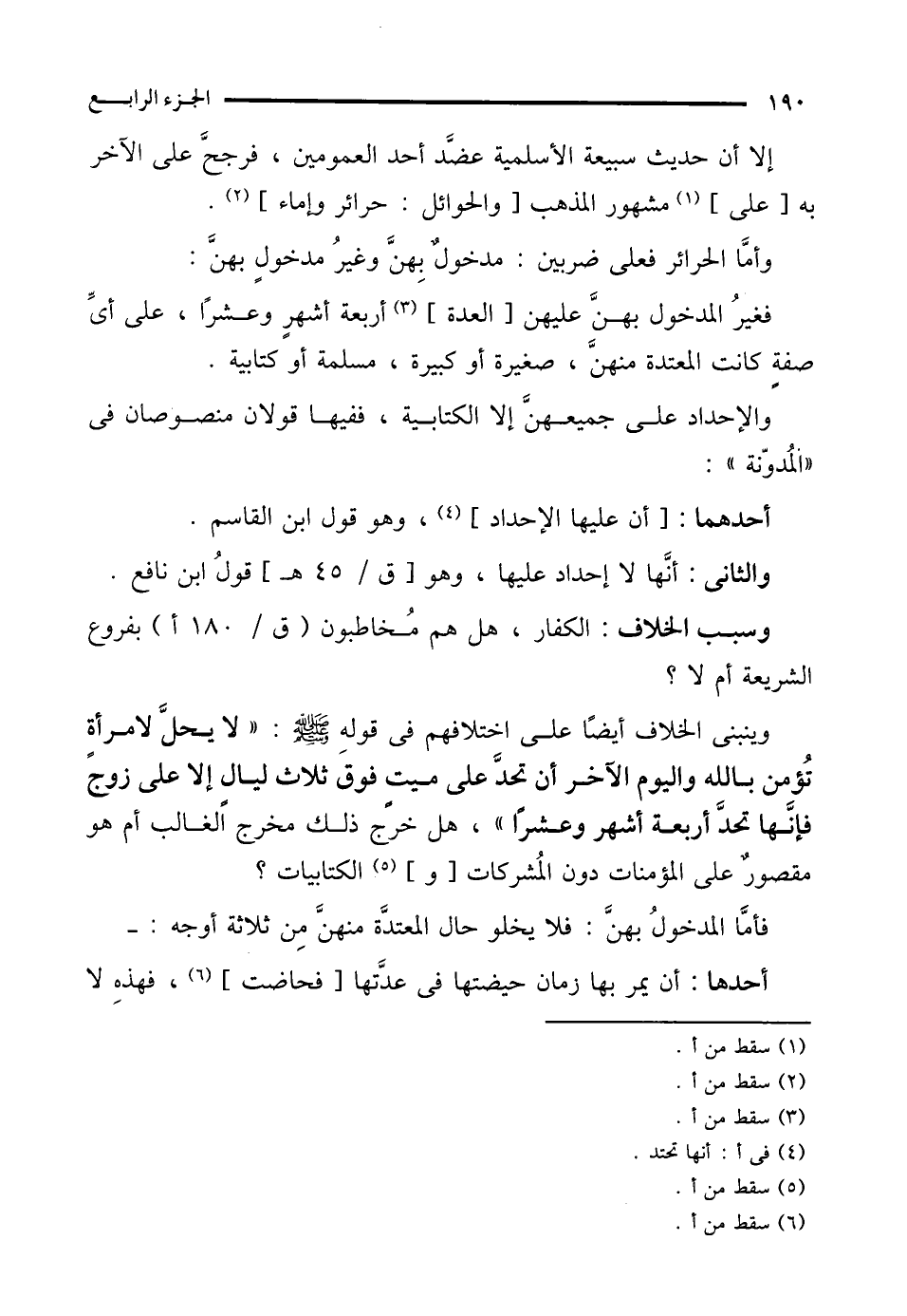 والإحداد على جميعهنَّ إلا الكتابية، ففيها قولان منصوصان في "المدوّنة":