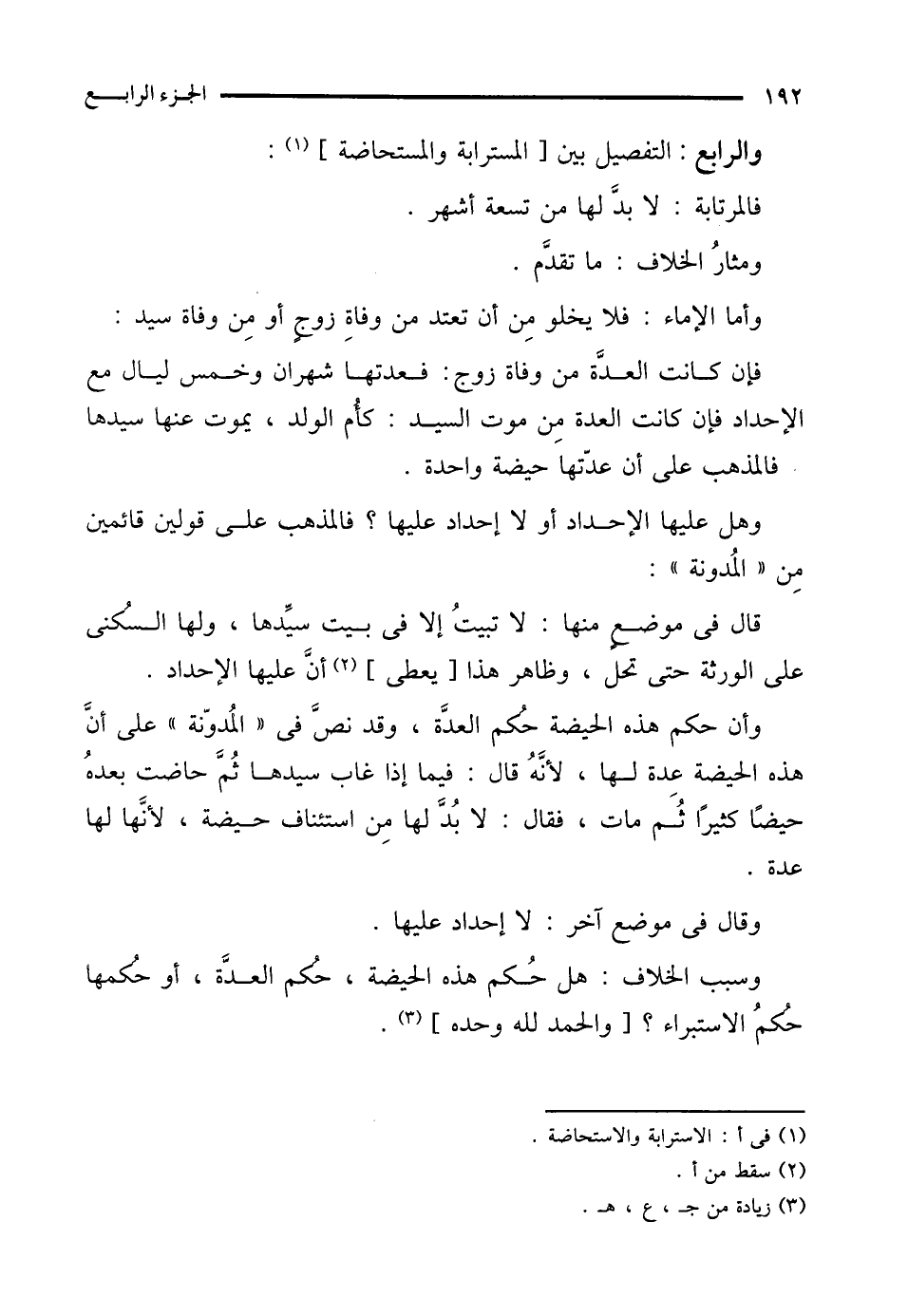 وأن حكم هذه الحيضة حُكم العدَّة، وقد نصَّ في "المُدوّنة" على أنَّ هذه الحيضة عِدة لها، لأنَّهُ قال: فيما إذا غاب سيدها ثُمَّ حاضت بعدهُ حيضًا كثيرًا ثُم مات، فقال: لابُدَّ لها مِن استئناف حيضة، لأنَّها لها عدة.