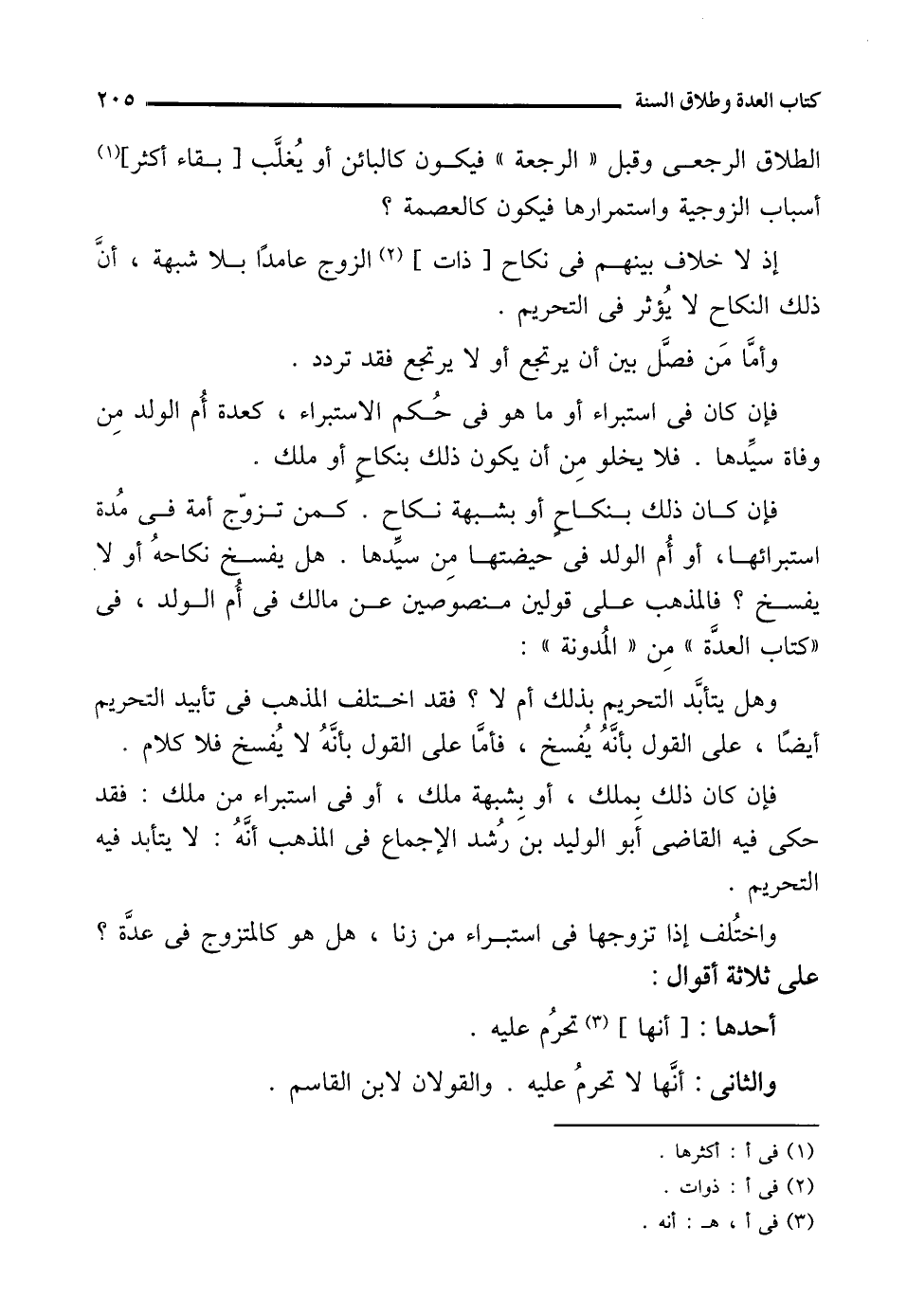 فإن كان ذلك بنكاحٍ أو بشبهة نكاح. كمن تزوّج أمة في مُدة استبرائها، أو أُم الولد في حيضتها مِن سيِّدها. هل يفسخ نكاحهُ أو لا يفسخ؟ فالمذهب على قولين منصوصين عن مالك في أُم الولد، في "كتاب العدَّة" مِن "المُدونة":