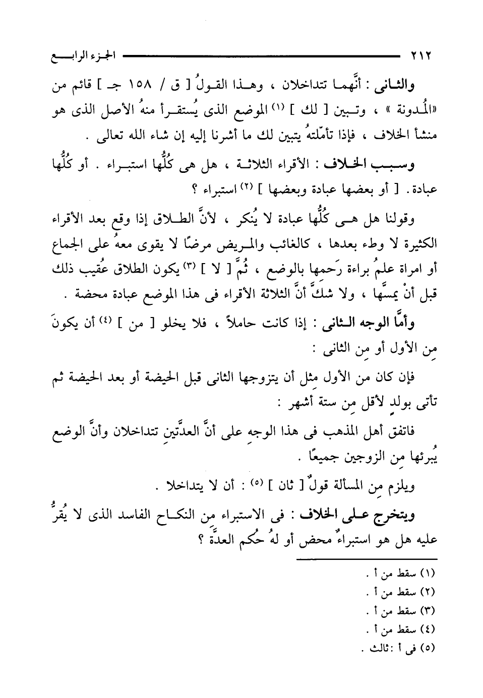 والثانى: أنَّهما تتداخلان، وهذا القولُ قائم من "المُدونة"، وتبين [لك] (¬1) الموضع الذي يُستقرأ منهُ الأصل الذي هو منشأ الخلاف، فإذا تأمّلتهُ يتبين لك ما أشرنا إليه إن شاء الله تعالى.