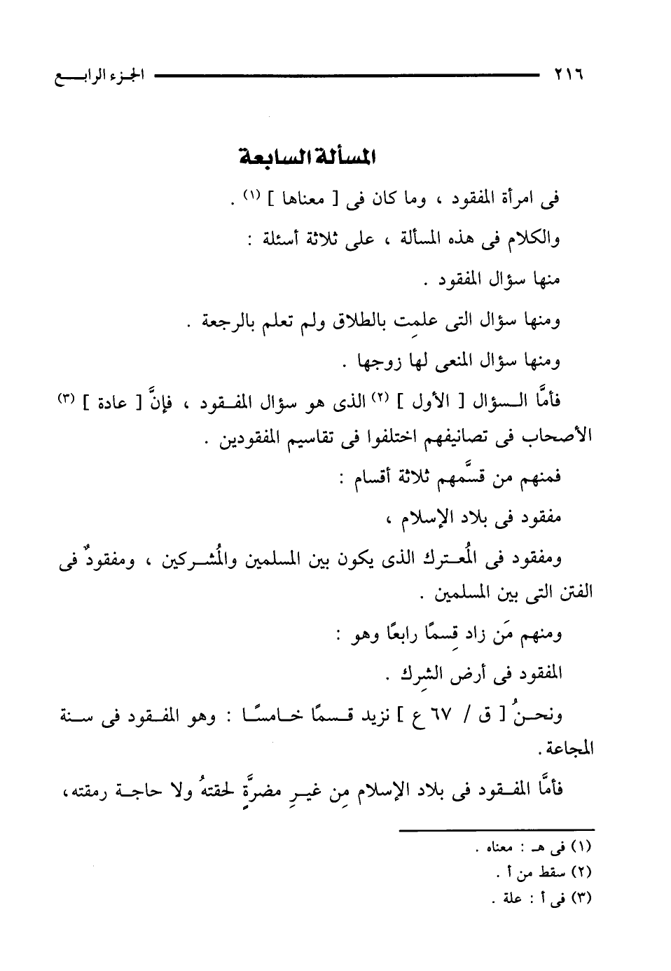 فأمَّا السؤال [الأول] (¬2) الذي هو سؤال المفقود، فإنَّ [عادة] (¬3) الأصحاب في تصانيفهم اختلفوا في تقاسيم المفقودين.