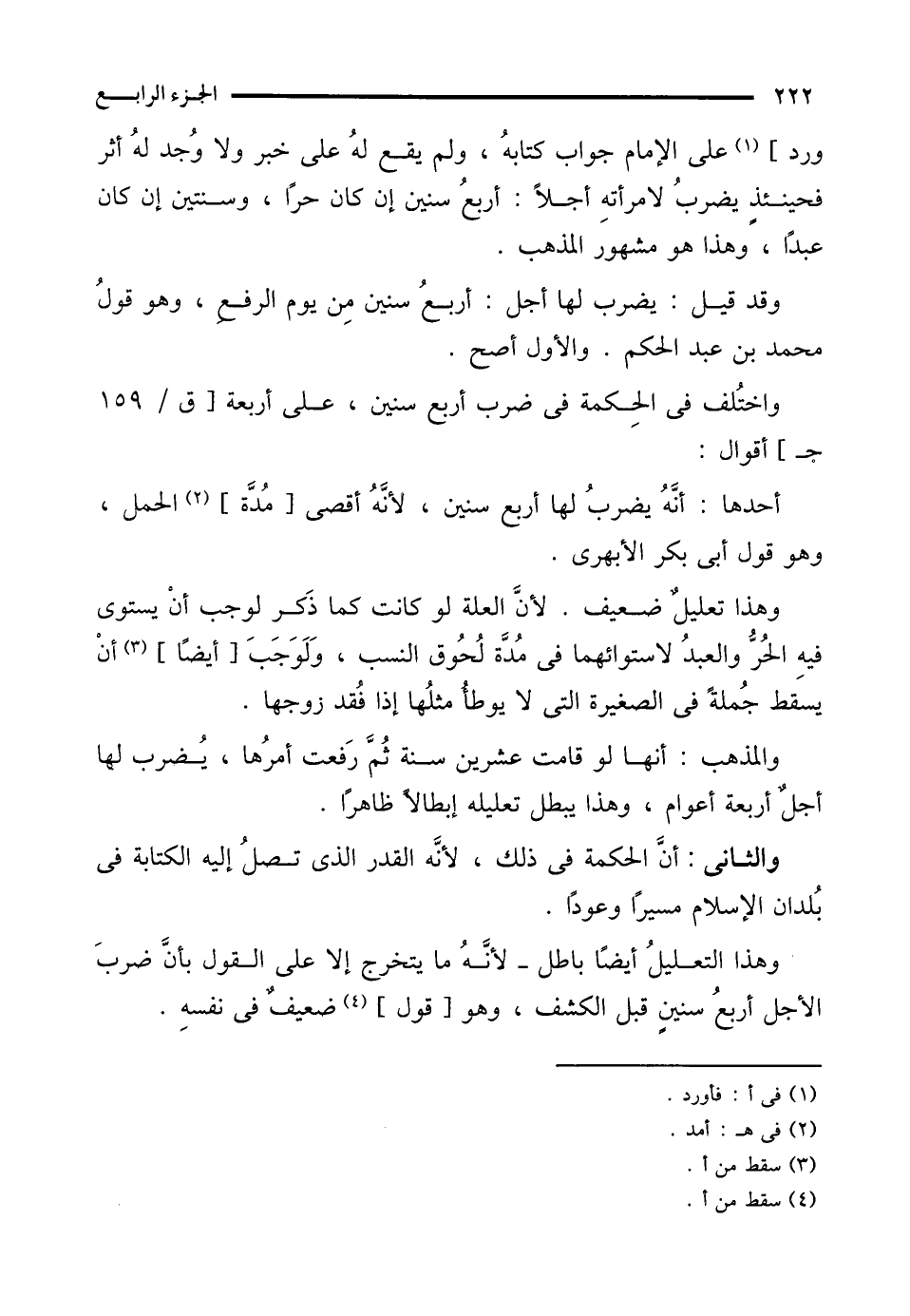 وقد قيل: يضرب لها أجل: أربعُ سنين مِن يوم الرفع، وهو قولُ محمَّد بن عبد الحكم. والأول أصح.