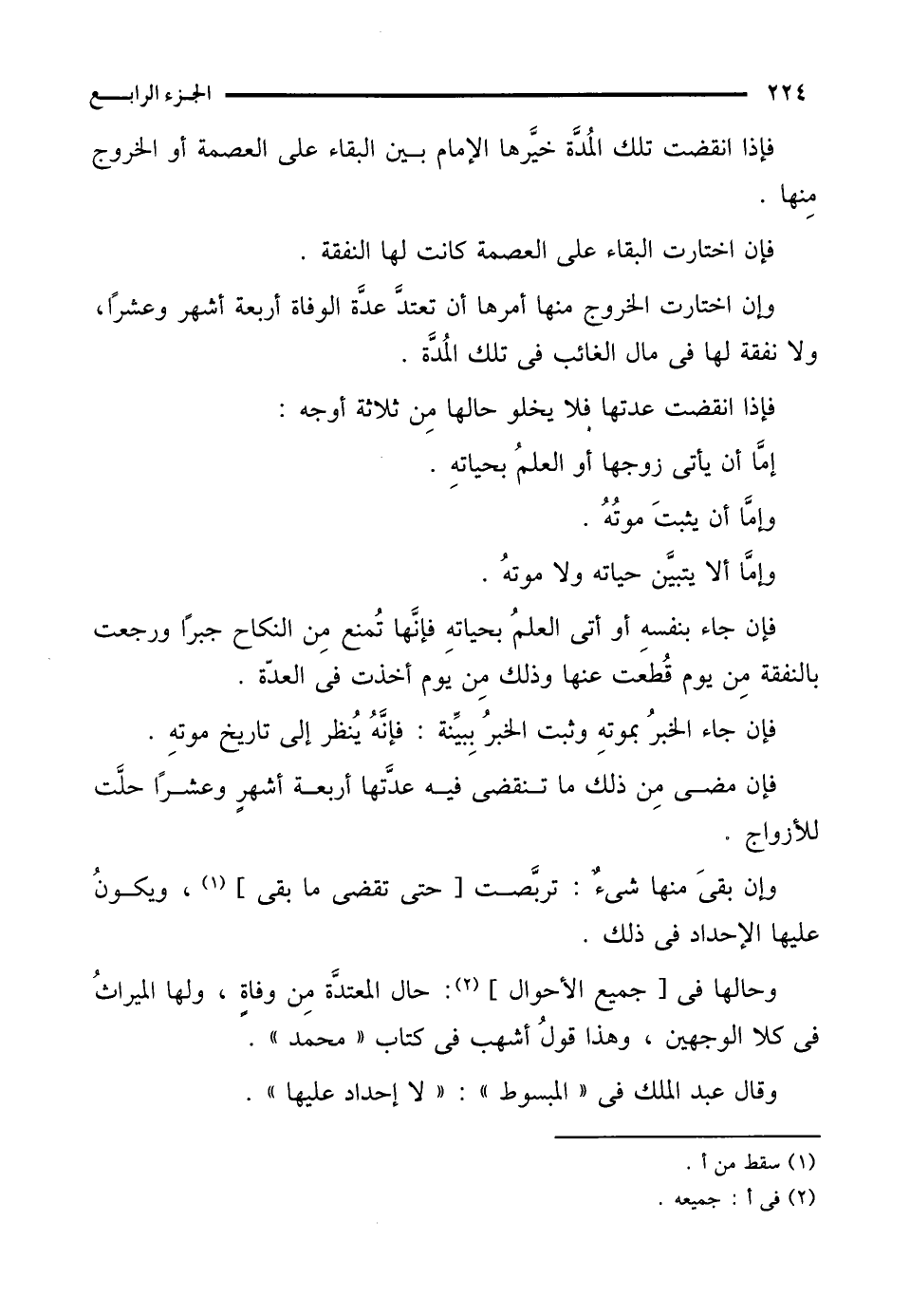 وإن اختارت الخروج منها أمرها أن تعتدَّ عدَّة الوفاة أربعة أشهر وعشرًا، ولا نفقة لها في مال الغائب في تلك المُدَّة.