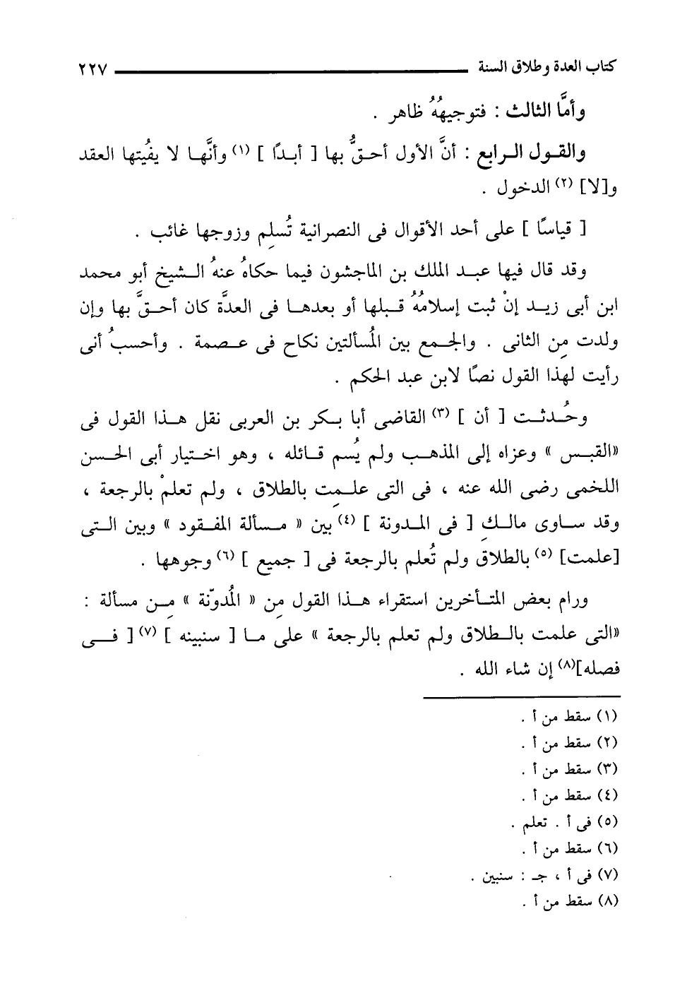 وقد قال فيها عبد الملك بن الماجشون فيما حكاهُ عنهُ الشيخ أبو محمَّد ابن أبي زيد إنْ ثبت إسلامُهُ قبلها أو بعدها في العدَّة كان أحقَّ بها وإن ولدت مِن الثاني. والجمع بين المسألتين نكاح في عصمة. وأحسبُ أنى رأيت لهذا القول نصًا لابن عبد الحكم.