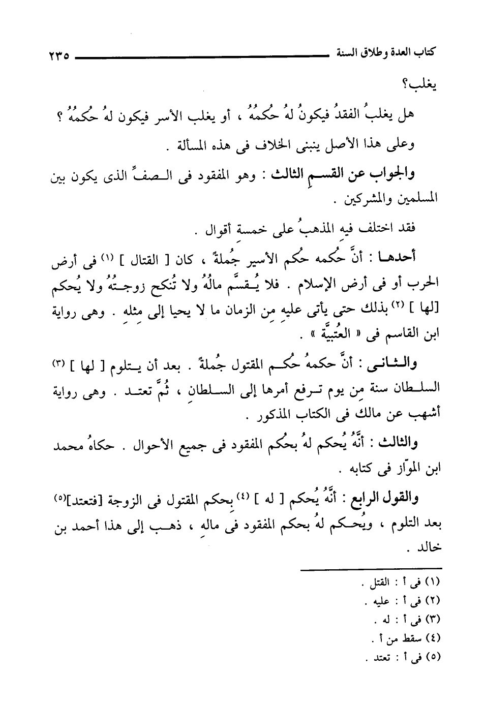 والقول الرابع: أنَّهُ يُحكم [له] (¬4) بِحكم المقتول في الزوجة [فتعتد] (¬5) بعد التلوم، ويُحكم لهُ بحكم المفقود في ماله، ذهب إلى هذا أحمد بن خالد.