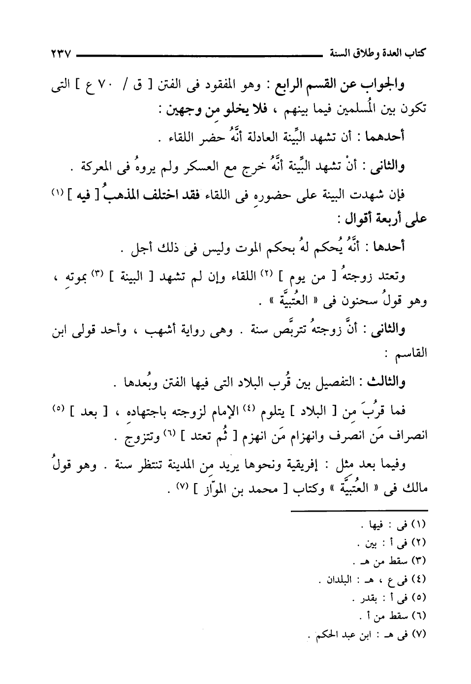 وتعتد زوجتهُ [من يوم] (¬2) اللقاء وإن لم تشهد [البينة] (¬3) بموته، وهو قولُ سحنون في "العُتبيَّة".