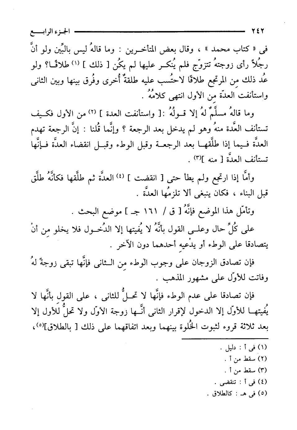 في "كتاب محمَّد"، وقال بعض المتأخرين: وما قاله ليس بالبِّين ولو أنَّ رجُلًا رأى زوجتهُ تتزوّج فلم يُنكر عليها لم يكُن [ذلك] (¬1) طلاقًا؟ ولو عُد ذلك مِن المرتجع طلاقًا لاحتُسب عليه طلقةٌ أُخرى وفُرق بينها وبين الثاني واستأنفت العدة مِن الأول انتهى كلامُهُ.
