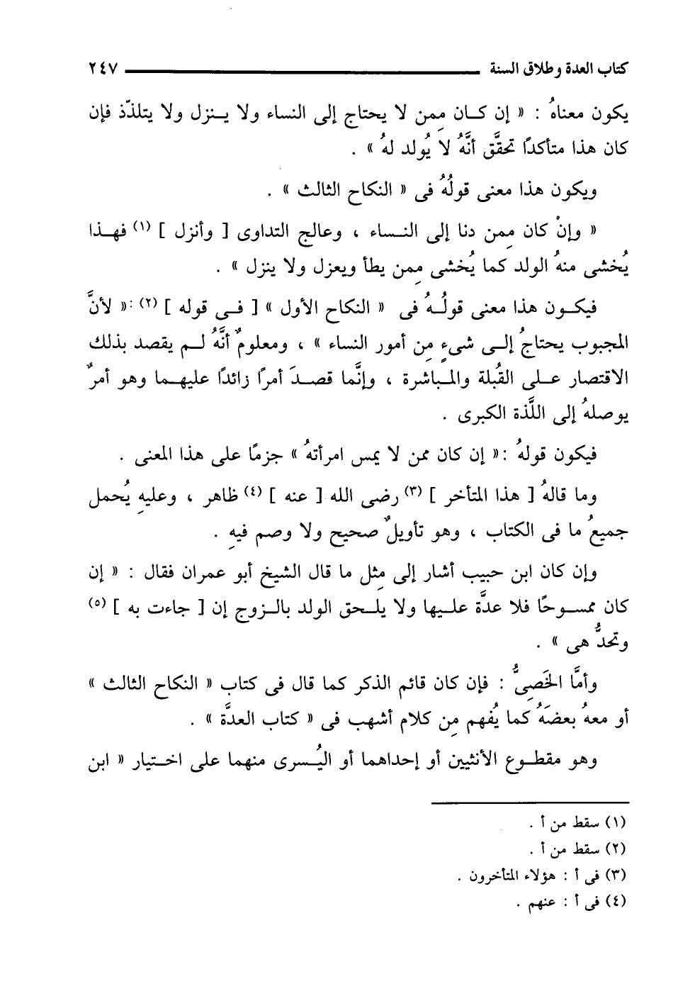 فيكون هذا معنى قولُهُ في "النكاح الأول" [في قوله] (¬2): "لأنَّ المجبوب يحتاجُ إلى شىءٍ مِن أمور النساء"، ومعلومٌ أنَّهُ لم يقصد بذلك الاقتصار على القُبلة والمباشرة، وإنَّما قصدَ أمرًا زائدًا عليهما وهو أمرٌ يوصلهُ إلى اللَّذة الكبرى.