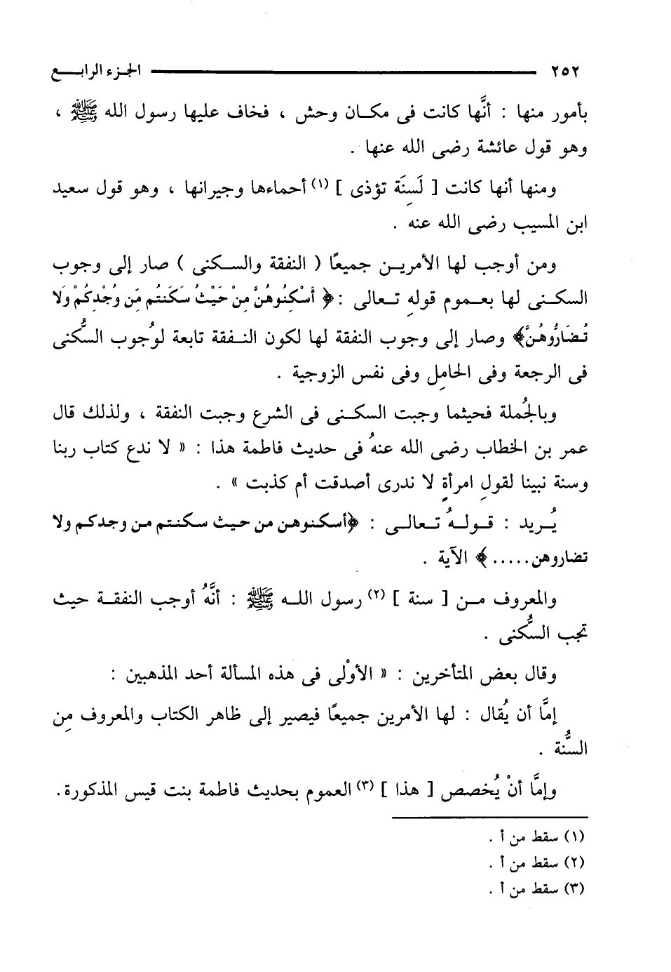 وبالجُملة فحيثما وجبت السكنى في الشرع وجبت النفقة، ولذلك قال عمر بن الخطاب رضي الله عنهُ في حديث فاطمة هذا: "لا ندع كتاب ربنا وسنة نبينا لقولِ امرأةٍ لا ندرى أصدقت أم كذبت".