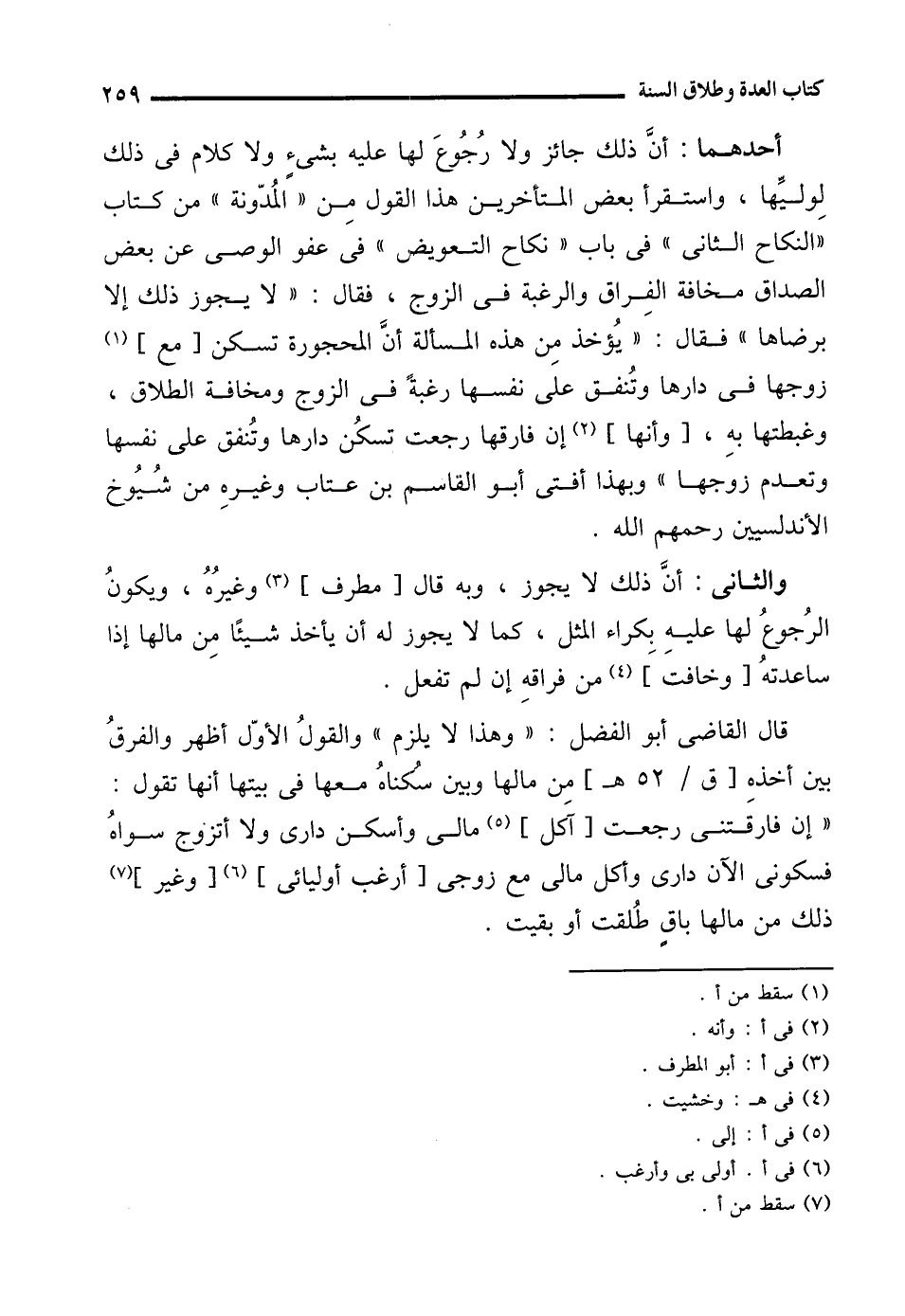 قال القاضى أبو الفضل: "وهذا لا يلزم" والقولُ الأوّل أظهر والفرقُ بين أخذه مِن مالها وبين سُكناهُ معها في بيتها أنها تقول: "إن فارقَتنى رجعت [آكل] (¬5) مالى وأسكن دارى ولا أتزوج سواهُ فسكونى الآن دارى وأكل مالى مع زوجى [أرغب أوليائى] (¬6) [وغير] (¬7) ذلك من مالها باقٍ طُلقت أو بقيت.