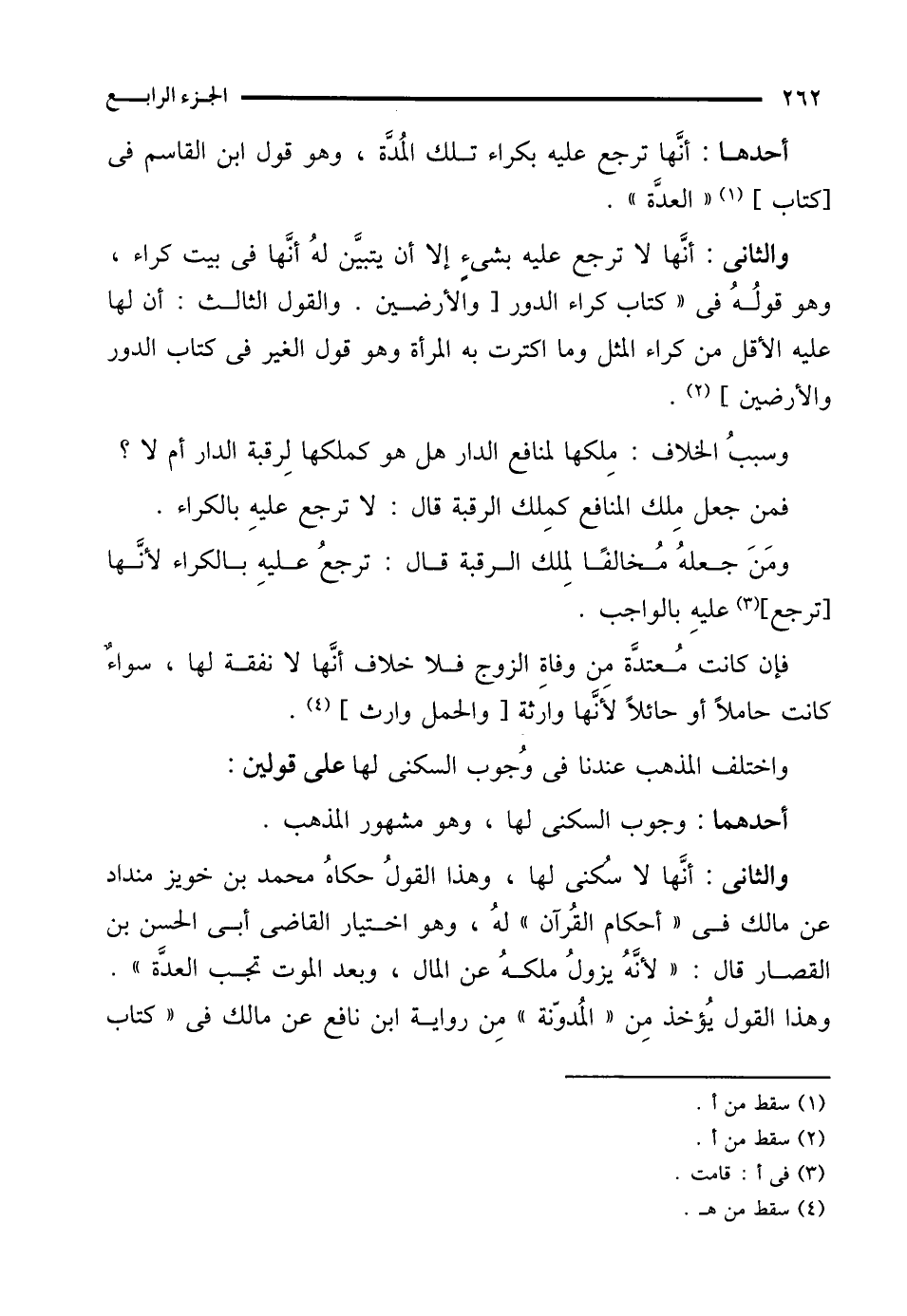 والثاني: أنَّها لا سكنى لها، وهذا القولُ حكاهُ محمَّد بن خويز منداد عن مالك في "أحكام القُرآن" لهُ، وهو اختيار القاضى أبى الحسن بن القصار قال: "لأنَّهُ يزولُ ملكهُ عن المال، وبعد الموت تجب العدَّة". وهذا القول يُؤخذ مِن "المُدوّنة" مِن رواية ابن نافع عن مالك في "كتاب