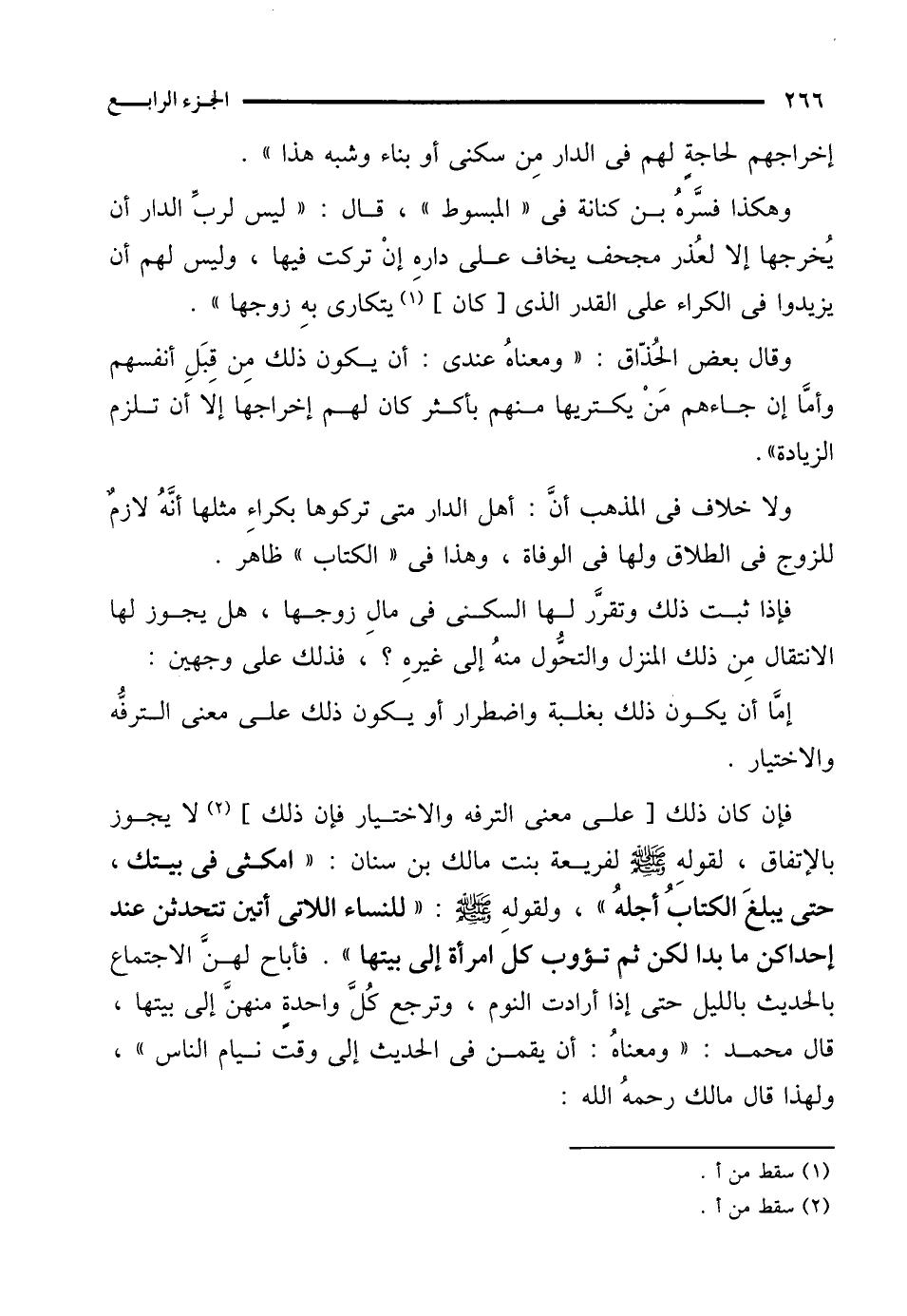 فإن كان ذلك [على معنى الترفه والاختيار فإن ذلك] (¬2) لا يجوز بالإتفاق، لقوله - صلى الله عليه وسلم - لفريعة بنت مالك بن سنان: "امكثى في بيتك، حتى يبلغَ الكتابُ أجلهُ"، ولقوله - صلى الله عليه وسلم -: "للنساء اللاتي أتين تتحدثن عند إحداكن ما بدا لكن ثم تؤوب كل امرأة إلى بيتها". فأباح لهنَّ الاجتماع بالحديث بالليل حتى إذا أرادت النوم، وترجع كُلَّ واحدةٍ منهنَّ إلى بيتها، قال محمَّد: "ومعناهُ: أن يقمن في الحديث إلى وقت نيام الناس"، ولهذا قال مالك رحمهُ الله: