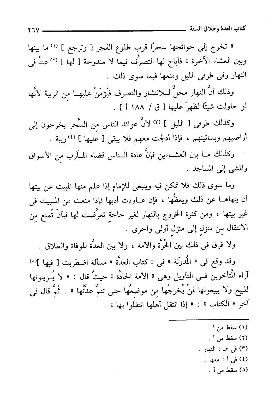 "تخرج إلى حوائجها سحرًا قرب طلوع الفجر [وترجع] (¬1) ما بينها وبين العشاء الآخرة" فأباح لها التصرُّف فيما لا مندوحة [لها] (¬2) عنهُ في النهار وفي طرفى الليل ومنعها فيما سوى ذلك.