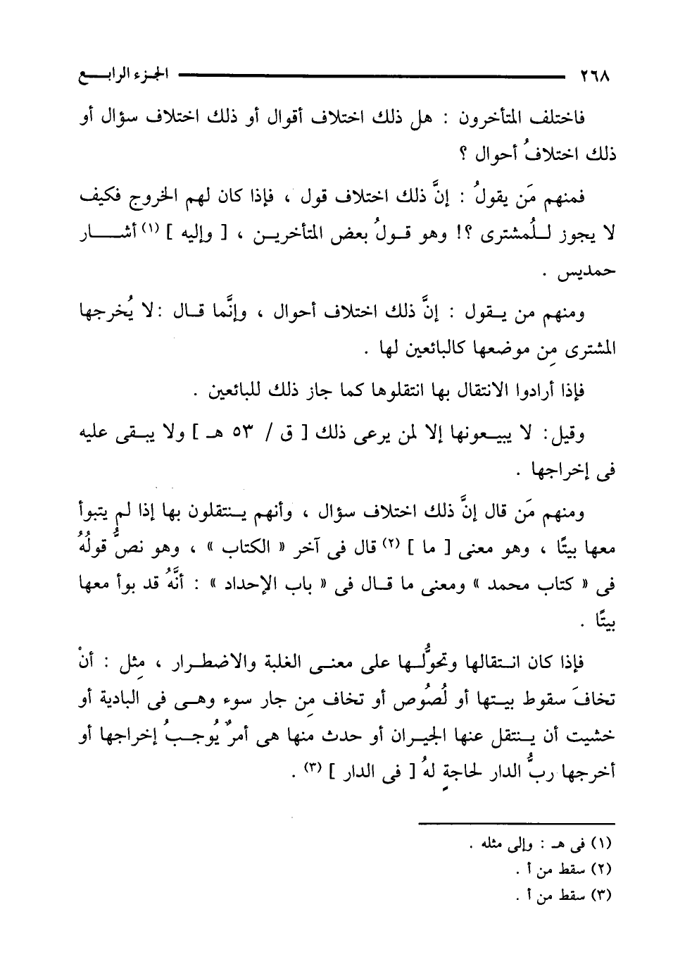 ومنهم مَن قال إنَّ ذلك اختلاف سؤال، وأنهم ينتقلون بها إذا لم يتبوأ معها بيتًا، وهو معنى [ما] (¬2) قال في آخر "الكتاب"، وهو نصُّ قولُهُ في "كتاب محمَّد" ومعنى ما قال في "باب الإحداد": أنَّه قد بوأ معها بيتًا.