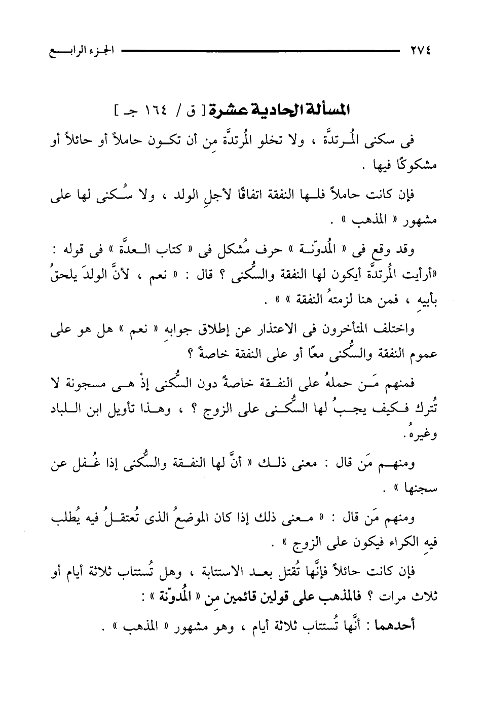 في سكنى المُرتدَّة، ولا تخلو المُرتدَّة مِن أن تكون حاملًا أو حائلًا أو مشكوكًا فيها.