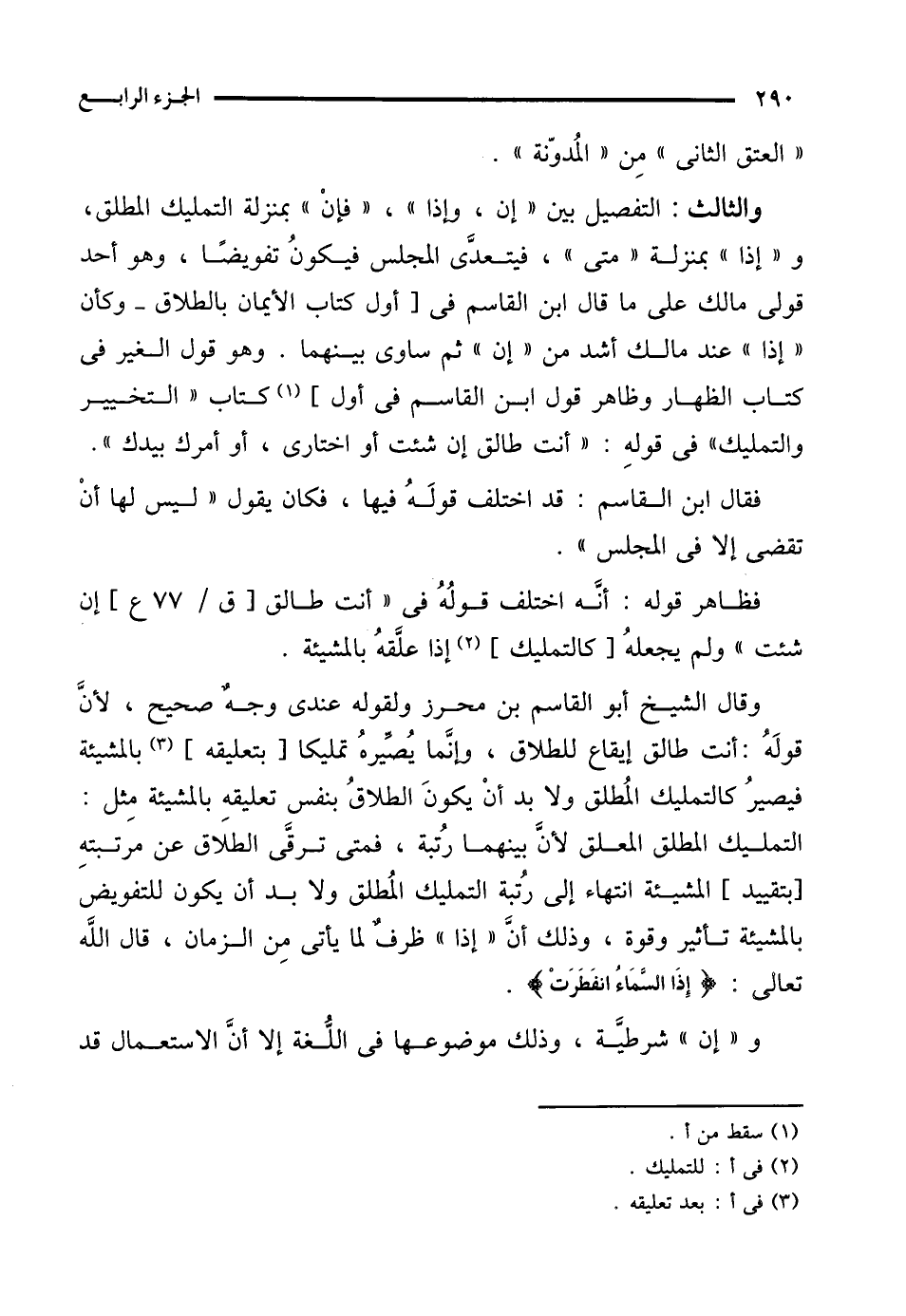 والثالث: التفصيل بين "إن، وإذا"، "فإنْ" بمنزلة التمليك المطلق، و"إذا" بمنزلة "متى"، فيتعدَّى المجلس فيكونُ تفويضًا، وهو أحد قولى مالك على ما قال ابن القاسم في [أول كتاب الأيمان بالطلاق -وكأن "إذا" عند مالك أشد من "إن" ثم ساوى بينهما. وهو قول الغير في كتاب الظهار وظاهر قول ابن القاسم في أول] (¬1) كتاب "التخيير والتمليك" في قولهِ: "أنت طالق إن شئت أو اختارى، أو أمرك بيدك".