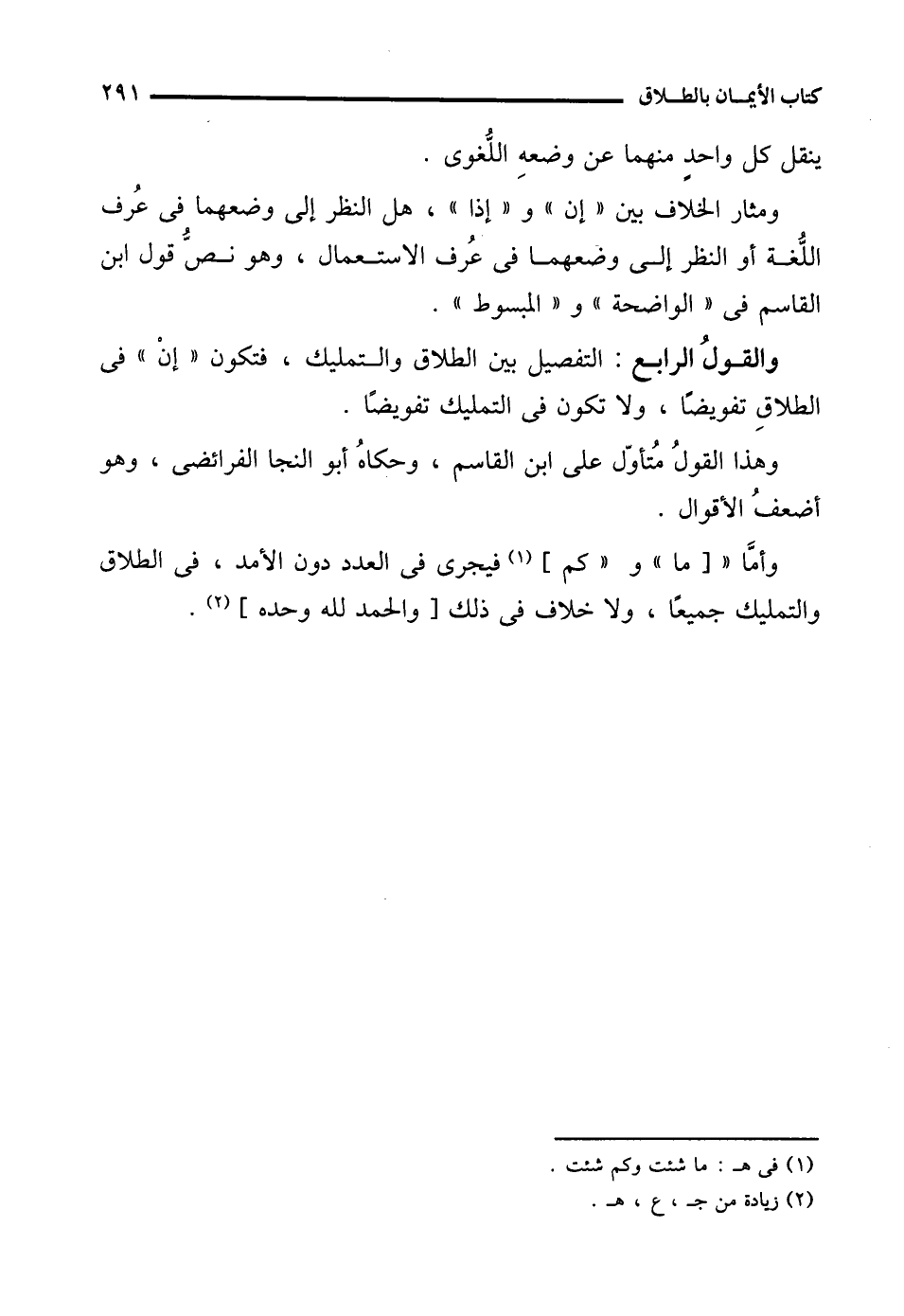 ومثار الخلاف بين "إن" و"إذا"، هل النظر إلى وضعهما في عُرف اللُّغة أو النظر إلى وضعهما في عُرف الاستعمال، وهو نصُّ قول ابن القاسم في "الواضحة" و"المبسوط".