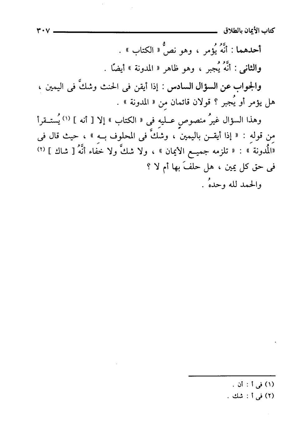 والجواب عن السؤال السادس: إذا أيقن في الحنث وشكَّ في اليمين، هل يؤمر أو يُجبر؟ قولان قائمان مِن "المدونة".