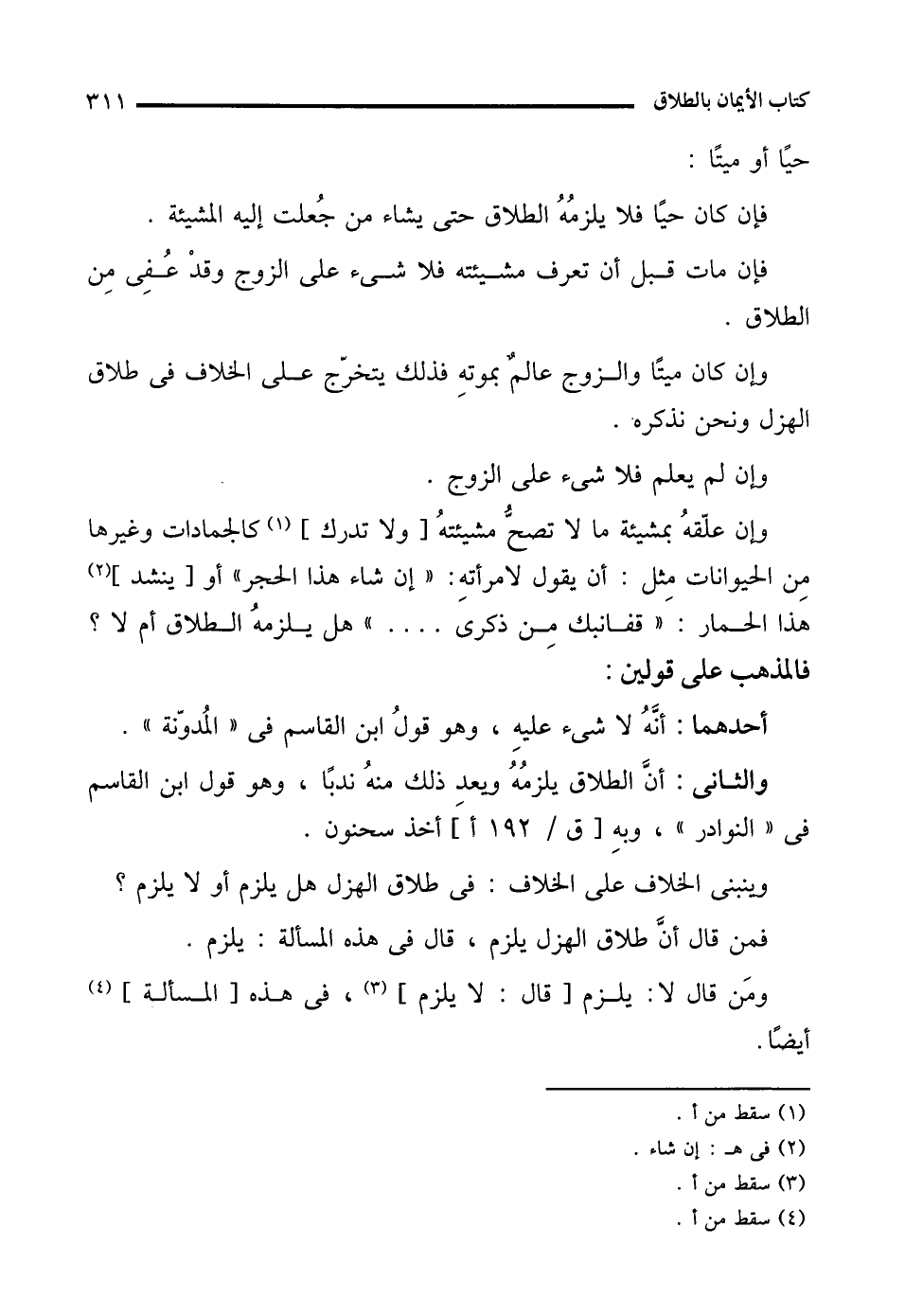وإن علّقهُ بمشيئة ما لا تصح مشيئتهُ [ولا تدرك] (¬1) كالجمادات وغيرها مِن الحيوانات مثل: أن يقول لامرأتهِ: "إن شاء هذا الحجر" أو [ينشد] (¬2) هذا الحمار: "قفا نبك مِن ذكرى. . . ." هل يلزمهُ الطلاق أم لا؟ فالمذهب على قولين: