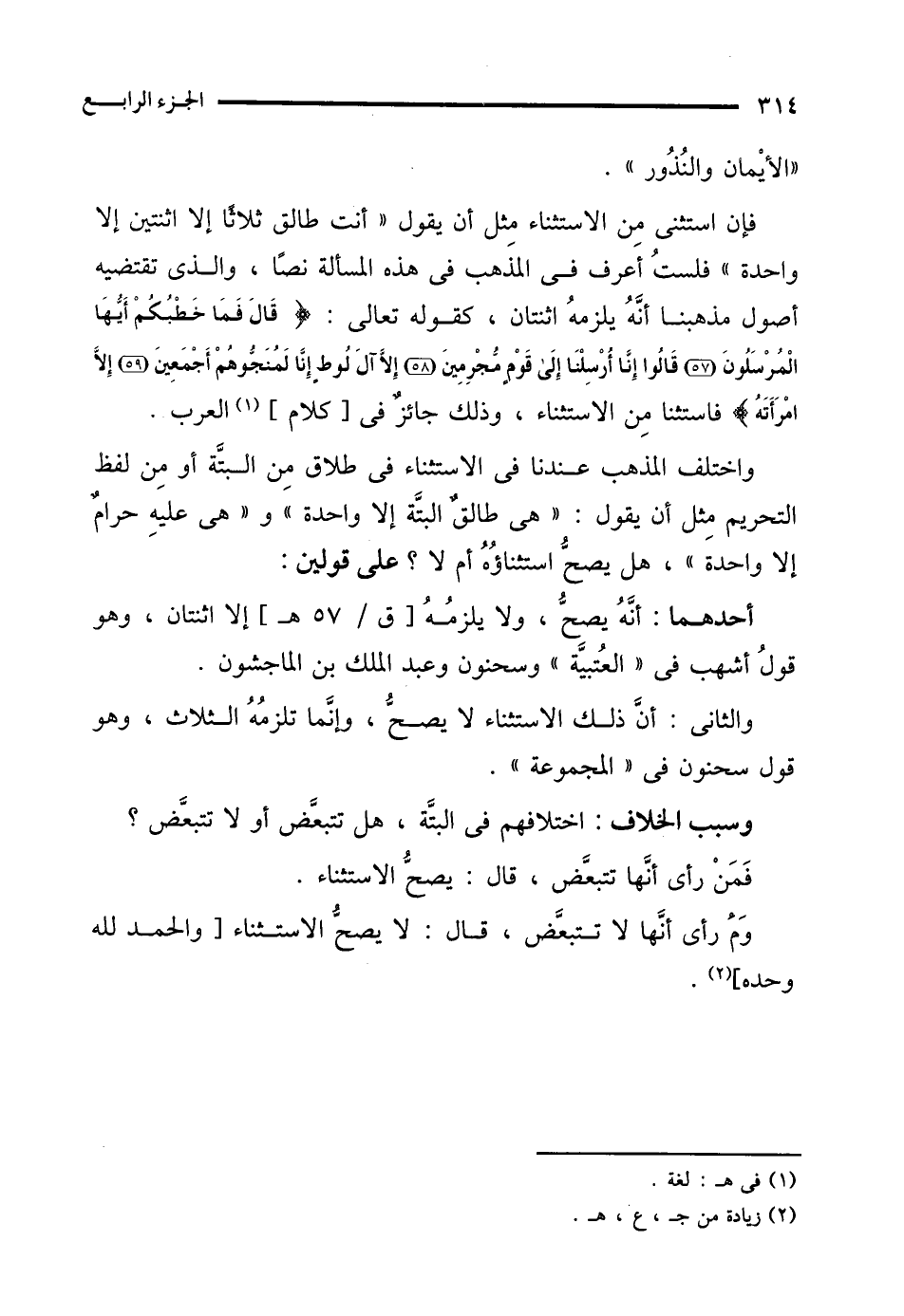 واختلف المذهب عندنا في الاستثناء في طلاق مِن البتَّة أو مِن لفظ التحريم مثل أن يقول: "هى طالقٌ البتَّة إلا واحدة" و"هى عليهِ حرامٌ إلا واحدة"، هل يصح استثناؤُهُ أم لا؟ على قولين: