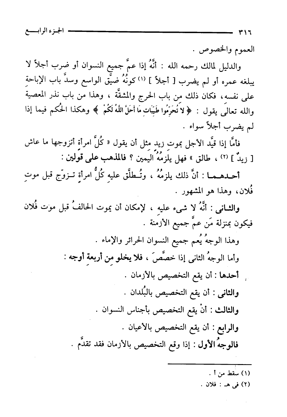والدليل لمالك رحمه الله: أنَّهُ إذا عمَّ جميع النسوان أو ضرب أجلًا لا يبلغه عمره أو لم يضرب [أجلًا] (¬1) كونُهُ ضيَّق الواسع وسدَّ باب الإباحةِ على نفسه، فكان ذلك مِن باب الحرج والمشقَّة، وهذا من باب نذر المعصية والله تعالى يقول: {لا تُحَرِّمُوا طَيِّبَاتِ مَا أَحَلَّ اللهُ لَكُمْ} وهكذا الحُكم فيما إذا لم يضرب أجلًا سواء.