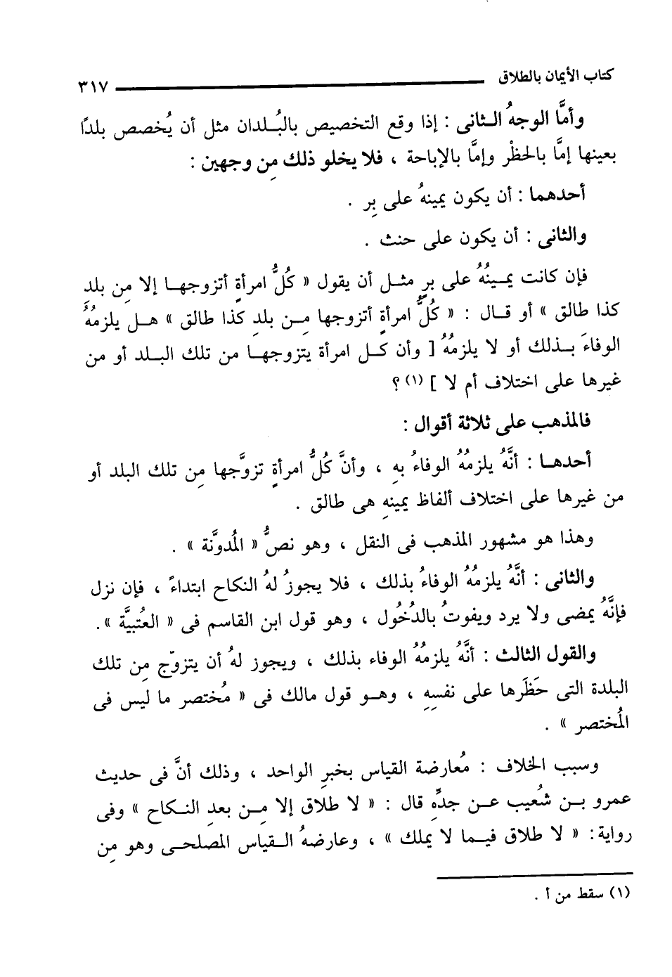 والقول الثالث: أنَّهُ يلزمُهُ الوفاء بذلك، ويجوز لهُ أن يتزوّج مِن تلك البلدة التي حَظَرها على نفسِهِ، وهو قول مالك في "مُختصر ما ليس في المُختصر".