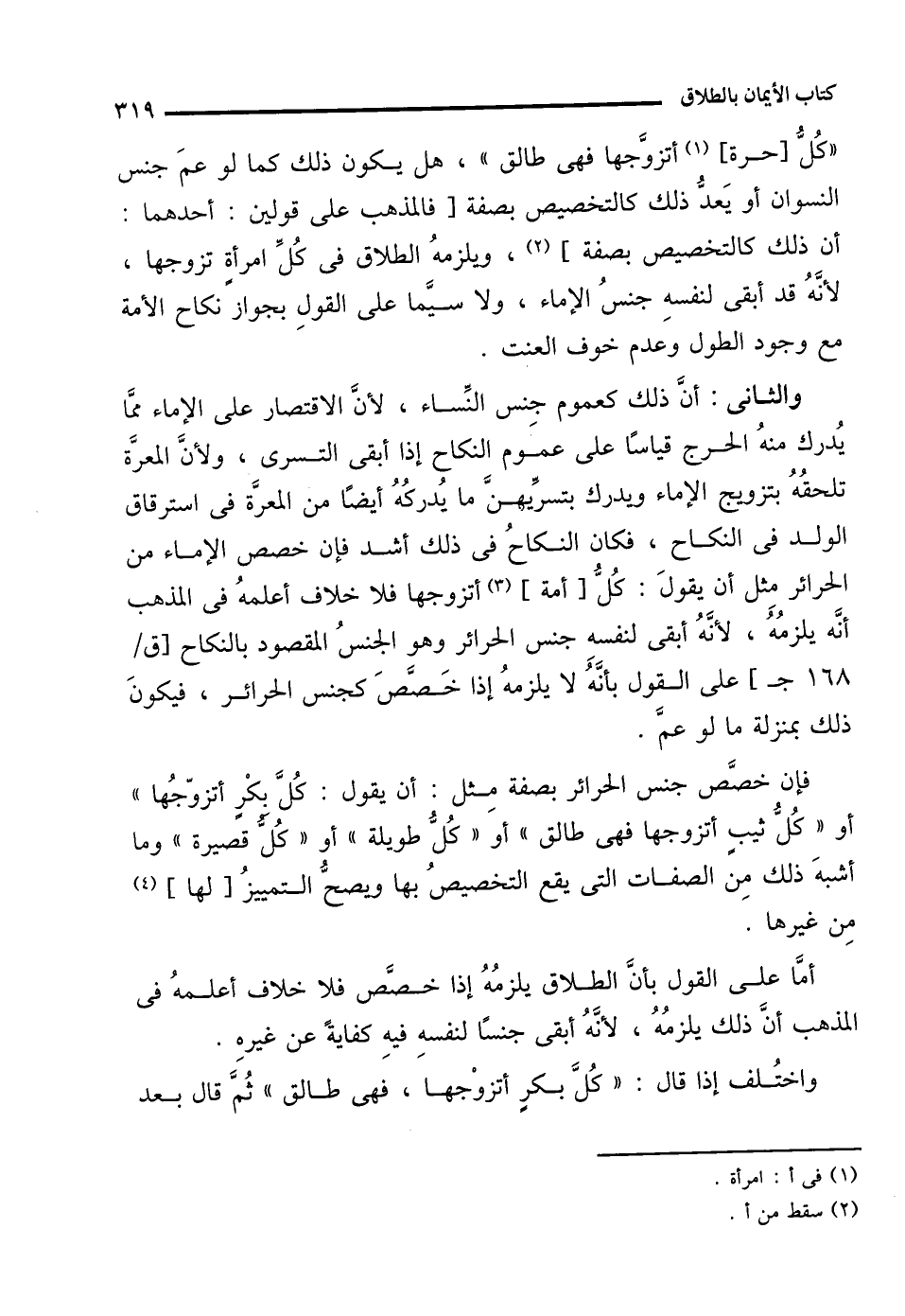 والثانى: أنَّ ذلك كعموم جِنس النِّساء، لأنَّ الاقتصار على الإماء ممَّا يُدرك منهُ الحرج قياسًا على عموم النكاح إذا أبقى التسرى، ولأنَّ المعرَّة تلحقُهُ بتزويج الإماء ويدرك بتسرِّيهنَّ ما يُدركُهُ أيضًا من المعرَّة في استرقاق الولد في النكاح، فكان النكاحُ في ذلك أشد فإن خصص الإماء من الحرائر مِثل أن يقولَ: كُلُّ [أمة] أتزوجها فلا خلاف أعلمهُ في المذهب أنَّه يلزمُهُ، لأنَّهُ أبقى لنفسهِ جنس الحرائر وهو الجنسُ المقصود بالنكاح على القول بأنَّهُ لا يلزمهُ إذا خَصَّصَ كجنس الحرائر، فيكونَ ذلك بمنزلة ما لو عمَّ.