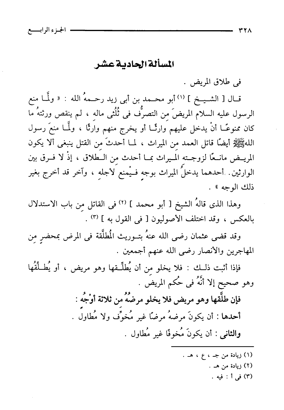 قال [الشيخ] (¬1) أبو محمَّد بن أبي زيد رحمهُ الله: "ولمَّا منع الرسول عليه السلام المريضَ مِن التصرُّف في ثُلُثى مالهِ، لم ينقص ورثتهُ ما كان ممنوعًا أنْ يدخل عليهم وارثًا أو يخرج منهم وارثًا، ولمَّا منعَ رسول الله - صلى الله عليه وسلم - أيضًا قاتل العمد مِن الميراث، لما أحدثَ مِن القتل ينبغى ألا يكون المريض مانعًا لزوجته الميراث بما أحدث مِن الطلاق، إذْ لا فرق بين الوارثين. أحدهما يدخلُ الميراث بوجهِ فيْمنع لأجلهِ، وآخر قد أخرج بغير ذلك الوجه".