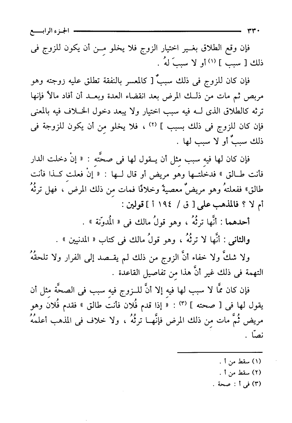 فإن كان للزوج في ذلك سببٌ [كالمعسر بالنفقة تطلق عليه زوجته وهو مربص ثم مات من ذلك المرض بعد انقضاء العدة وبعد أن أفاد مالًا فإنها ترثه كالطلاق الذي له فيه سبب اختيار ولا يبعد دخول الخلاف فيه بالمعنى فإن كان للزوج في ذلك بسبب] (¬2)، فلا يخلو مِن أن يكون للزوجة في ذلك سببٌ أو لا سبب لها.