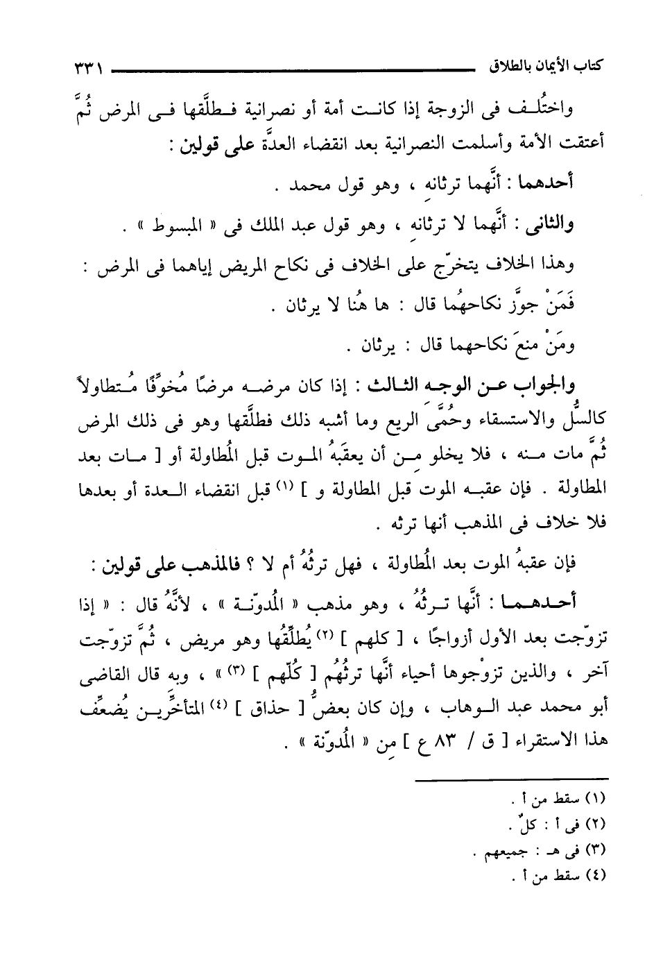 واختُلف في الزوجة إذا كانت أمة أو نصرانية فطلَّقها في المرض ثُمَّ أعتقت الأمة وأسلمت النصرانية بعد انقضاء العدَّة على قولين: