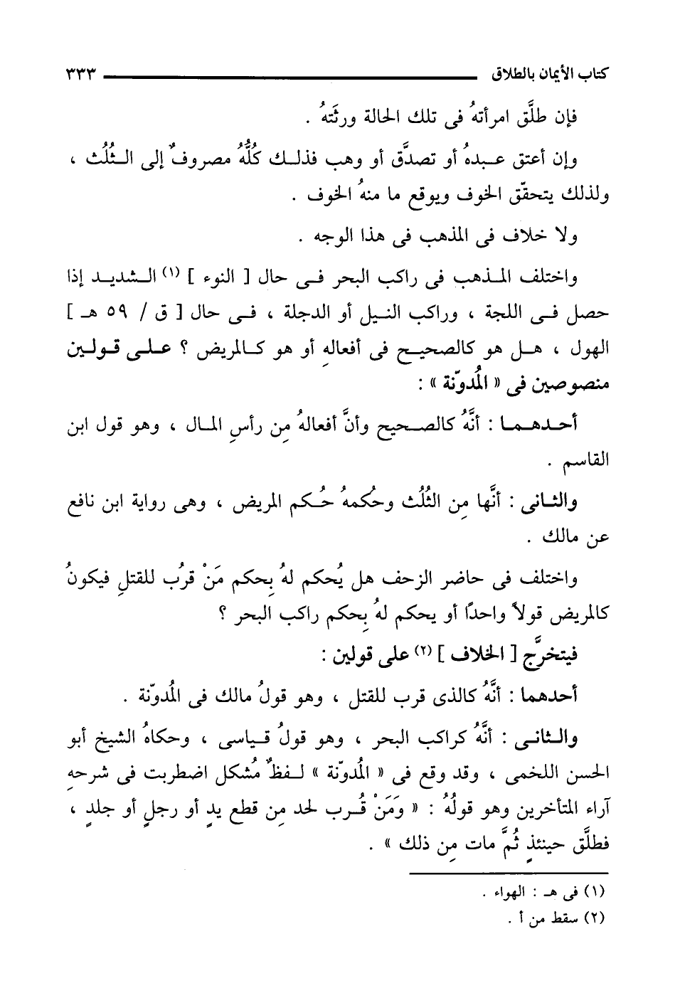 واختلف المذهب في راكب البحر في حال [النوء] (¬1) الشديد إذا حصل في اللجة، وراكب النيل أو الدجلة، في حال الهول، هل هو كالصحيح في أفعالهِ أو هو كالمريض؟ على قولين منصوصين في "المُدوّنة":