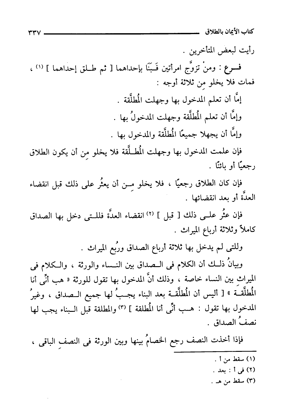 وبيانُ ذلك أن الكلام في الصداق بين النساء والورثة، والكلام في الميراث بين النساء خاصة، وذلك أنَّ المدخول بها تقول للورثة "هب أنِّي أنا المُطلَّقة" [أليس أن المُطلَّقة بعد البناء يجبُ لها جميع الصداق، وغيرُ المدخول بها تقول: هب أنِّى أنا المُطلقة] (¬3) والمطلقة قبل البناء يجب لها نصفُ الصداق.