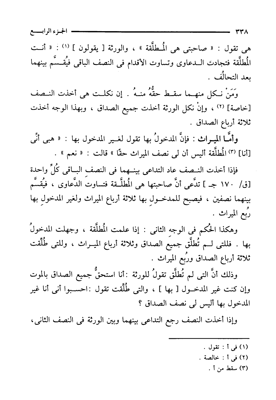 وأمَّا الميراث: فإنَّ المدخولُ بها تقول لغير المدخول بها: "هبى أنِّى [أنا] (¬3) المُطلَّقة أليس أن لي نصف الميراث حقًا" قالت: "نعم".
