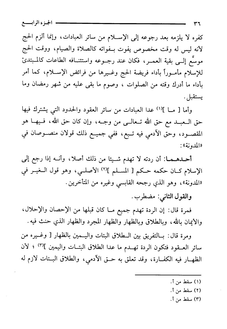 ومرة قال: بالتفريق بين الطلاق البتات واليمين بالظهار [وغيره من سائر العقود فتكون الردة تهدم ما عدا الطلاق البتات واليمين] (¬3)؛ لأن الظهار فيه الكفارة، وقد تعلق به حق الآدمي، والطلاق البتات لازم له