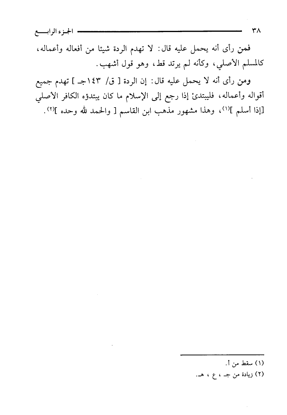 ومن رأى أنه لا يحمل عليه قال: إن الردة تهدم جميع أقواله وأعماله، فليبتدئ إذا رجع إلى الإِسلام ما كان يبتدؤه الكافر الأصلي [إذا أسلم] (¬1)، وهذا مشهور مذهب ابن القاسم [والحمد لله وحده] (¬2).