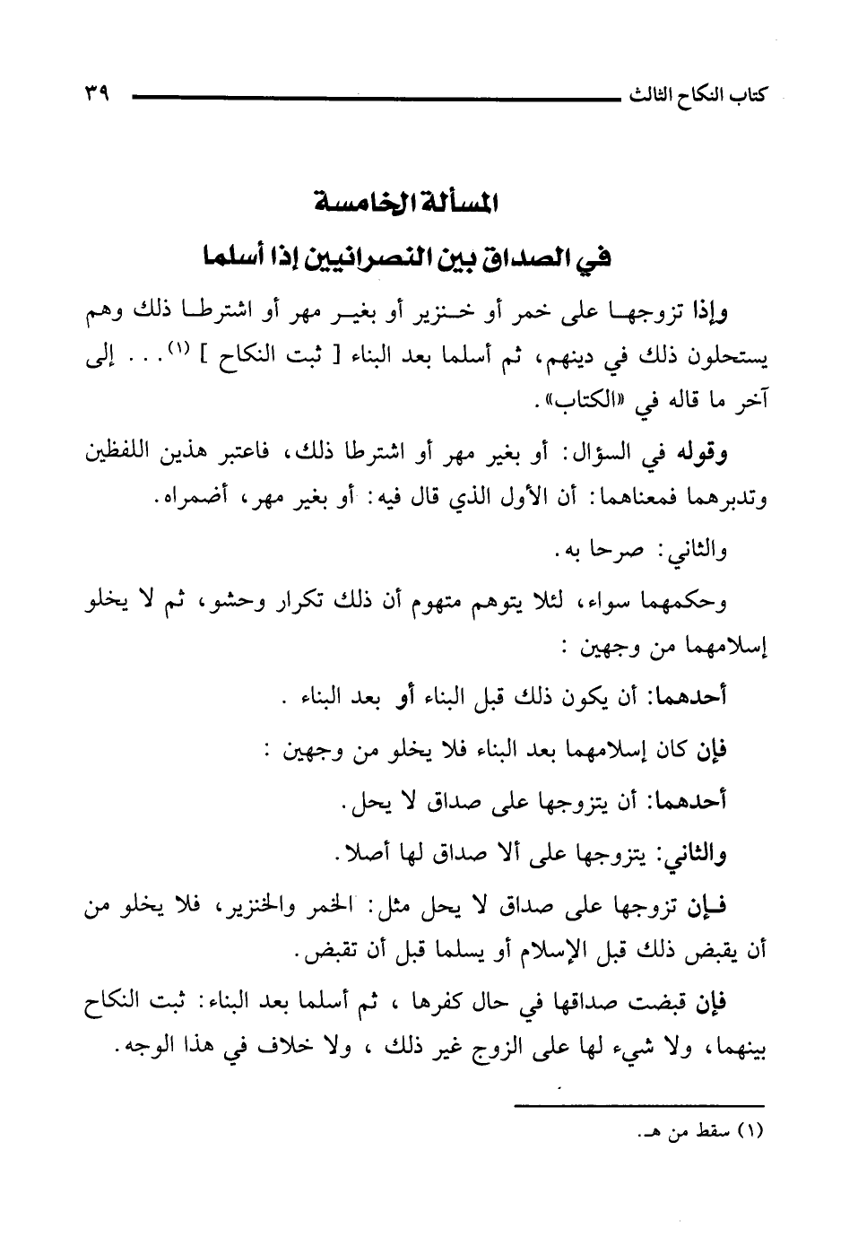 المسألة الخامسة في الصداق بين النصرانيين إذا أسلما