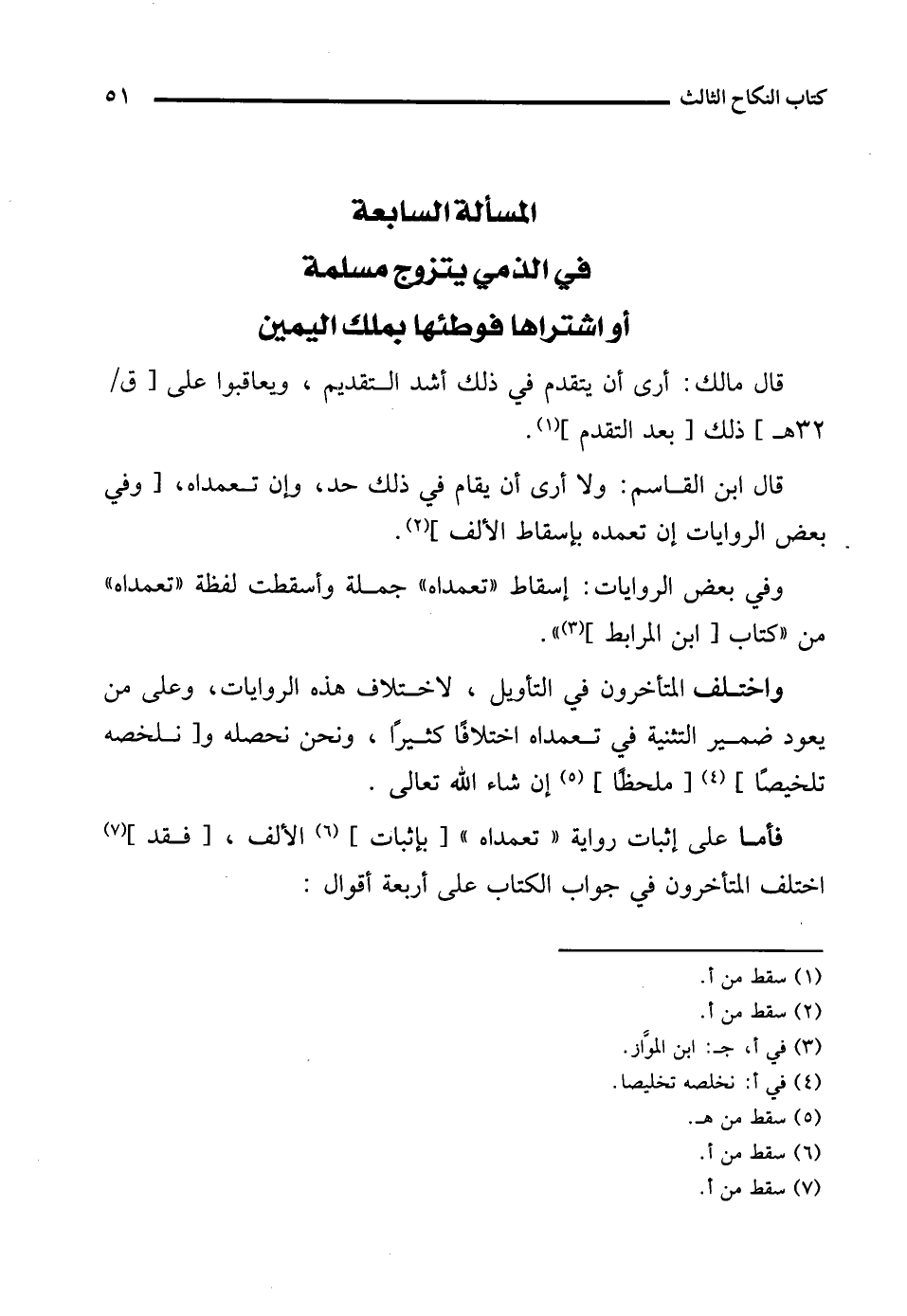 المسألة السابعة في الذمي يتزوج مسلمة أو اشتراها فوطئها بملك اليمين