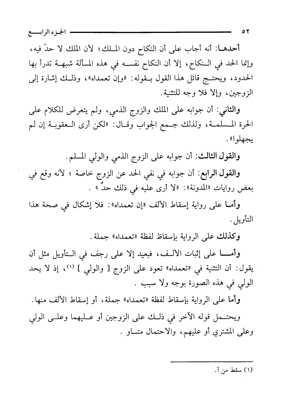 والقول الرابع: أن جوابه في نفي الحد عن الزوج خاصة؛ لأنه وقع في بعض روايات "المدونة": "لا أرى عليه في ذلك حدٌ".
