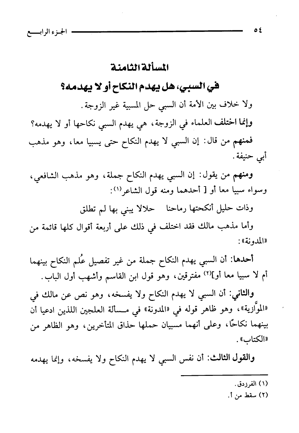 المسألة الثامنة في السبي، هل يهدم النكاح أو لا يهدمه؟