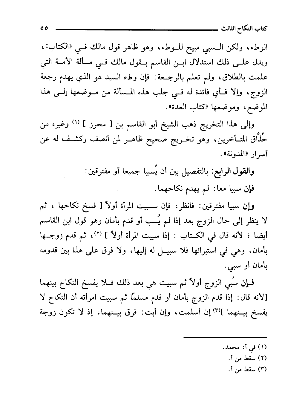 الوطء، ولكن السبي مبيح للوطء، وهو ظاهر قول مالك في "الكتاب"، ويدل على ذلك استدلال ابن القاسم بقول مالك في مسألة الأمة التي علمت بالطلاق، ولم تعلم بالرجعة: فإن وطء السيد هو الذي يهدم رجعة الزوج، وإلا فأي فائدة له في جلب هذه المسألة من موضعها إلى هذا الموضع، وموضعها "كتاب العدة".