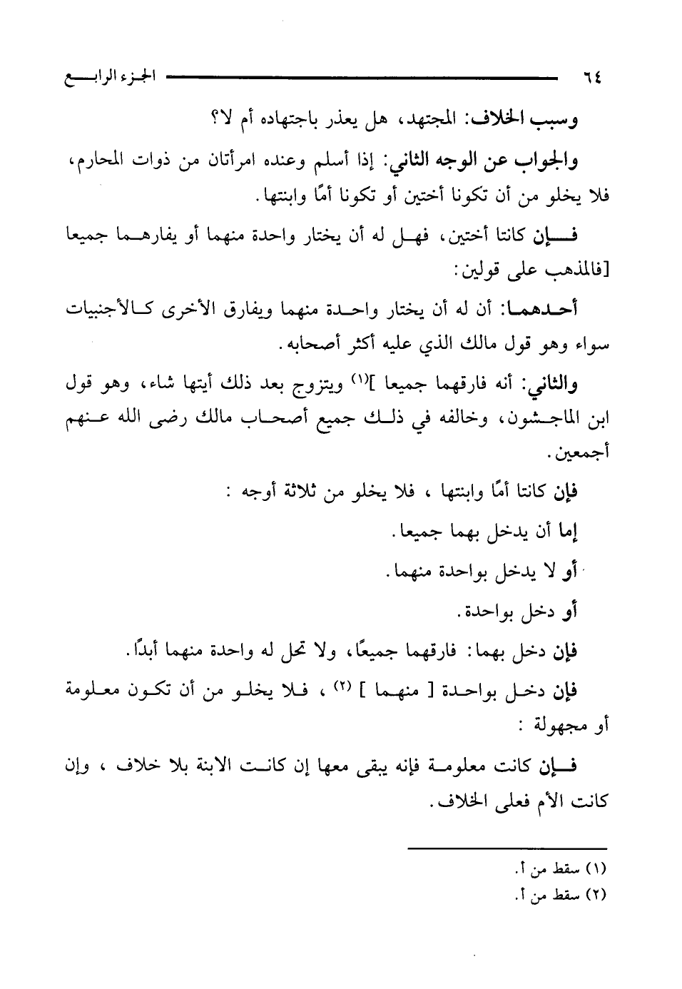 والجواب عن الوجه الثاني: إذا أسلم وعنده امرأتان من ذوات المحارم، فلا يخلو من أن تكونا أختين أو تكونا أمًا وابنتها.