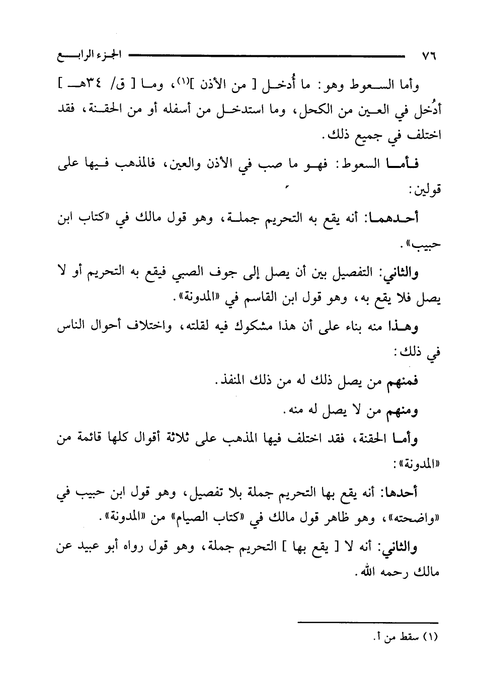 وأما السعوط وهو: ما أُدخل [من الأذن] (¬1)، وما أُدخل في العين من الكحل، وما استدخل من أسفله أو من الحقنة، فقد اختلف في جميع ذلك.
