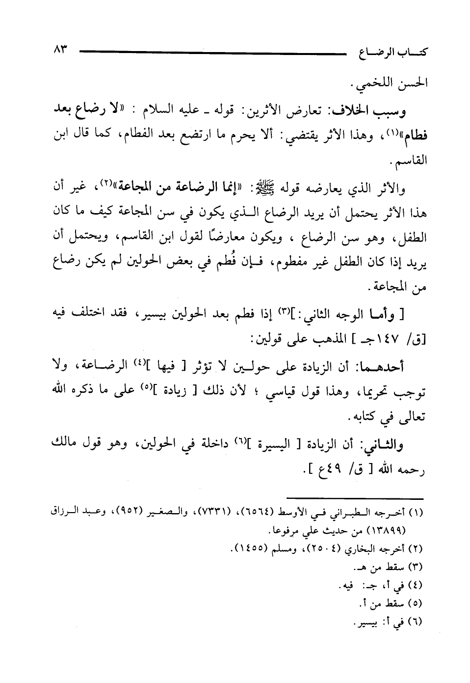 والأثر الذي يعارضه قوله - صلى الله عليه وسلم -: "إنما الرضاعة من المجاعة" (¬2)، غير أن هذا الأثر يحتمل أن يريد الرضاع الذي يكون في سن المجاعة كيف ما كان الطفل، وهو سن الرضاع، ويكون معارضًا لقول ابن القاسم، ويحتمل أن يريد إذا كان الطفل غير مفطوم، فإن فُطم في بعض الحولين لم يكن رضاع من المجاعة.