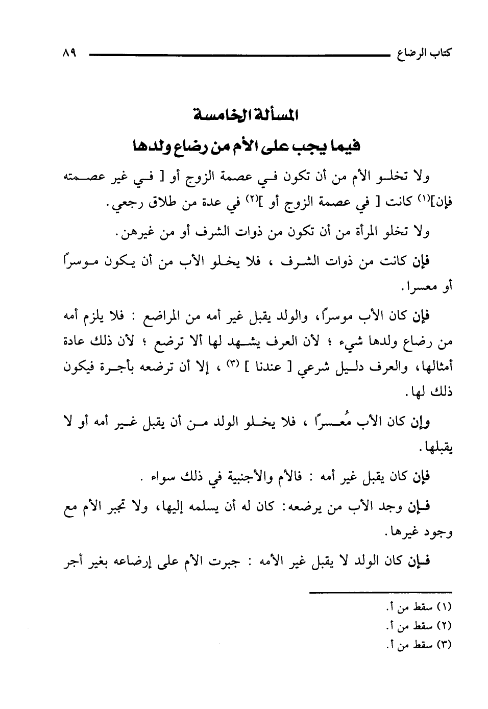 المسألة الخامسة فيما يجب على الأم من رضاع ولدها