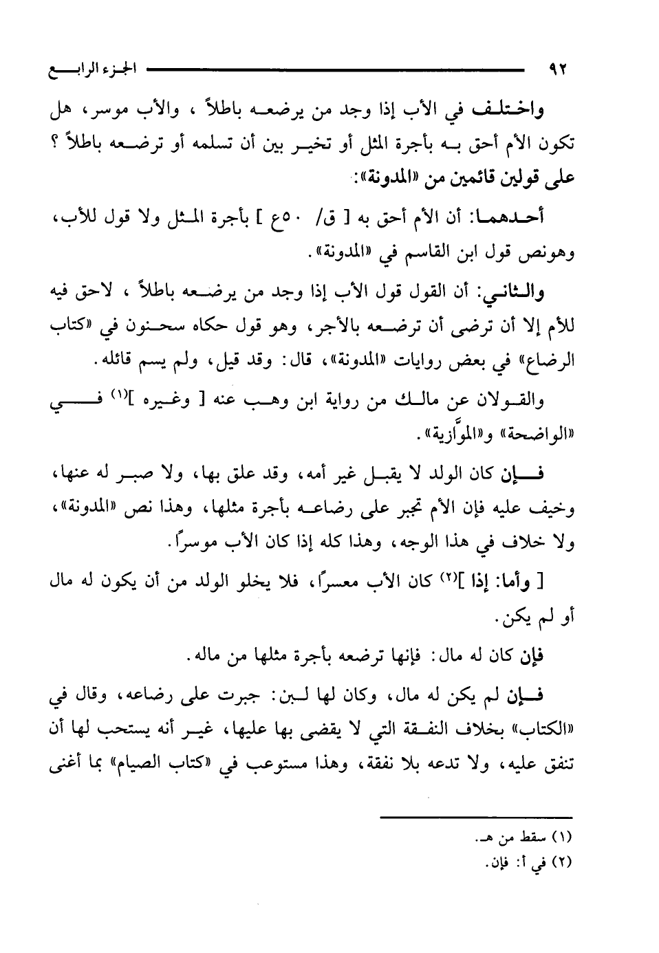واختلف في الأب إذا وجد من يرضعه باطلًا، والأب موسر، هل تكون الأم أحق به بأجرة المثل أو تخير بين أن تسلمه أو ترضعه باطلًا؟ على قولين قائمين من "المدونة":
