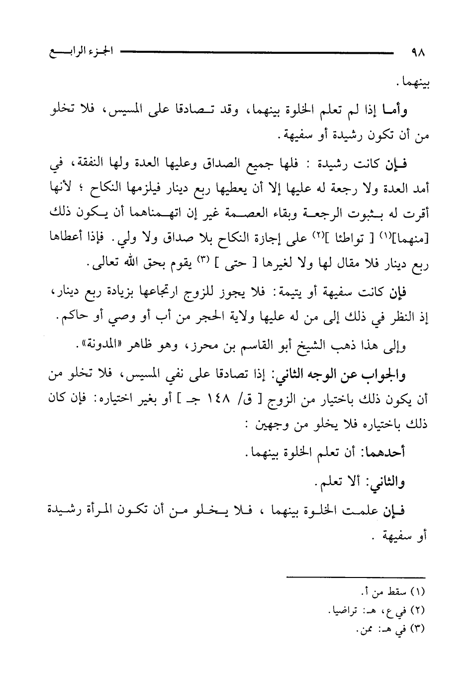 فإن علمت الخلوة بينهما، فلا يخلو من أن تكون المرأة رشيدة أو سفيهة.