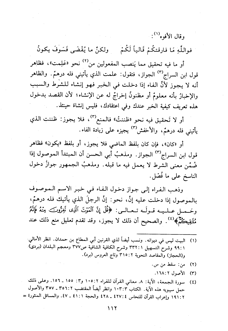وذهب الفراء إلى جواز دخول الفاء في خبر الاسم الموصوف بالموصول إذا دخلت عليه إن، نحو: إن الرجل الذي يأتيك فله درهم، وحمل عليه قوله تعالى: {قُلْ إنَّ المَوْتَ الَّذِي تَفِرُّونَ مِنْهُ فَإنَّهُ مُلاقِيكُمْ}. والصحيح أن ذلك لا يجوز، وقد تقدم تعليل منع ذلك عند
