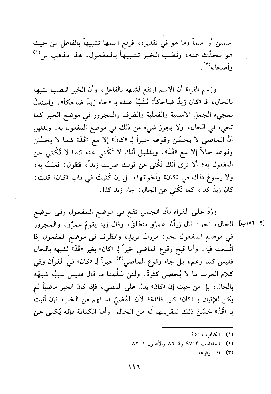 وزعم الفراء أن الاسم ارتفع لشبهه بالفاعل، وأن الخبر انتصب لشبهه بالحال، فـ"كان زيد ضاحكًا" مشبه عنده بـ"جاء زيد ضاحكًا". واستدل بمجيء الجمل الاسمية والفعلية والظرف والمجرور في موضع الخبر كما تجيء في الحال، ولا يجوز شيء من ذلك في موضع المفعول به. وبدليل أن الماضي لا يحسن وقوعه خبرًا لـ"كان" إلا مع "قد" كما لا يحسن وقوعه حالًا إلا مع "قد". وبدليل أنك لا تكني عنه كما لا تكني عن المفعول به؛ ألا ترى أنك تكني عن قولك ضربت زيدًا، فتقول: فعلت به، ولا يسوغ ذلك في "كان" وأخواتها، بل إن كنيت في باب "كان" قلت: كان زيد كذا، كما تكني عن الحال: جاء زيد كذا.