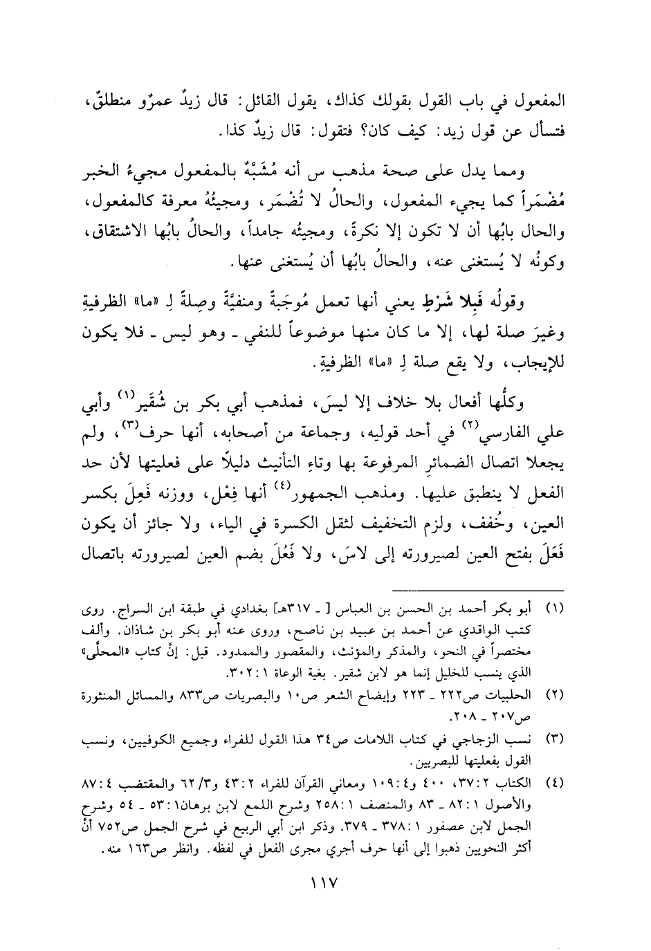 المفعول في باب القول بقولك كذاك، يقول القائل: قال زيد عمرو منطلق، فتسأل عن قول زيد: كيف كان؟ فتقول: قال زيد كذا.